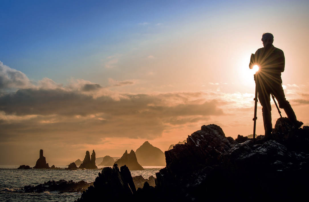 Para conseguir la estrella de sol es necesario cerrar mucho el diafragma; de esta forma se produce la difracción en las láminas del obturador. Víctor, el protagonista de nuestra toma, necesita el trípode, porque está tomando imágenes con exposiciones cercanas al segundo. Así le dará textura de seda a las olas cuando rompan.