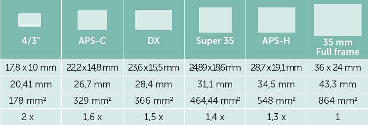 Tabla de tamaños y factores de conversión de los formatos de sensor más comunes