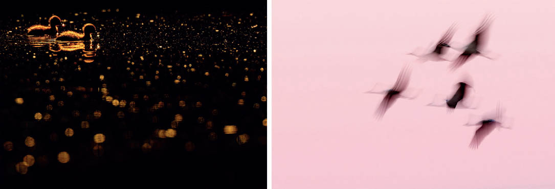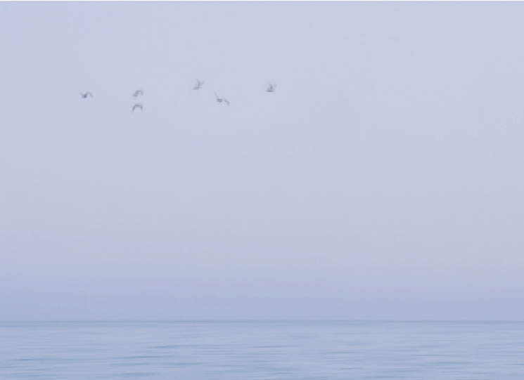 La imagen aúna eficazmente dos elementos narrativos. El vuelo difuso de las aves, que denota acción y lapso temporal, se enmarca en un espacio sutilmente expandido por un horizonte bajo y el resultado monotonal.