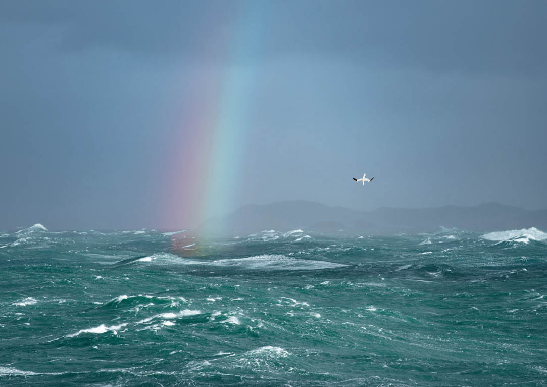 A esta escena se superpone un momento crítico: el vuelo en picado de un alcatraz. Este pequeño detalle, además de establecer un atractivo sincronismo con el arcoíris, refuerza la idea de unidad y confluencia del paisaje y la naturaleza.