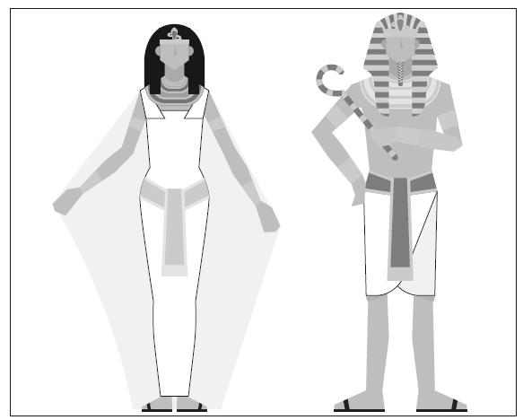 Египетские мужчины носили передник в форме треугольника или прямоугольника – схенти. Женщины наряжались в длинную рубаху из прямоугольного куска ткани на бретельках – тунику из льна с бахромой, расклешенной у колен. Такой покрой назывался «каласирис». Примерно понять, как выглядела эта одежда, можно по древним египетским фрескам и скульптурам.