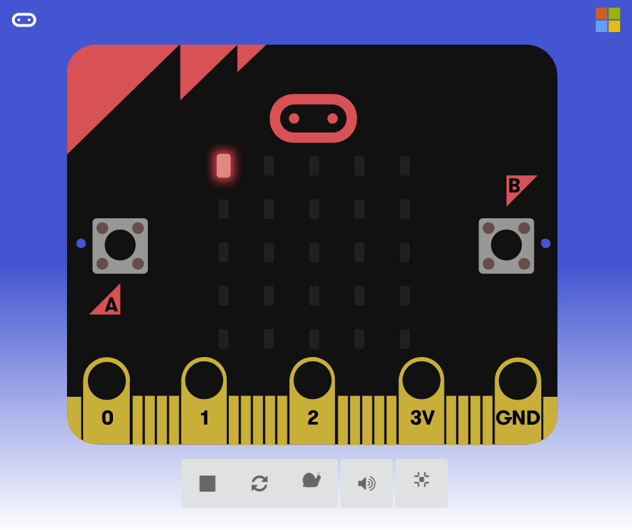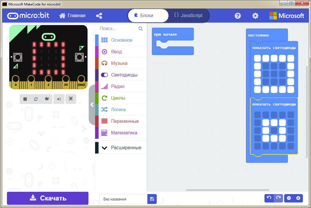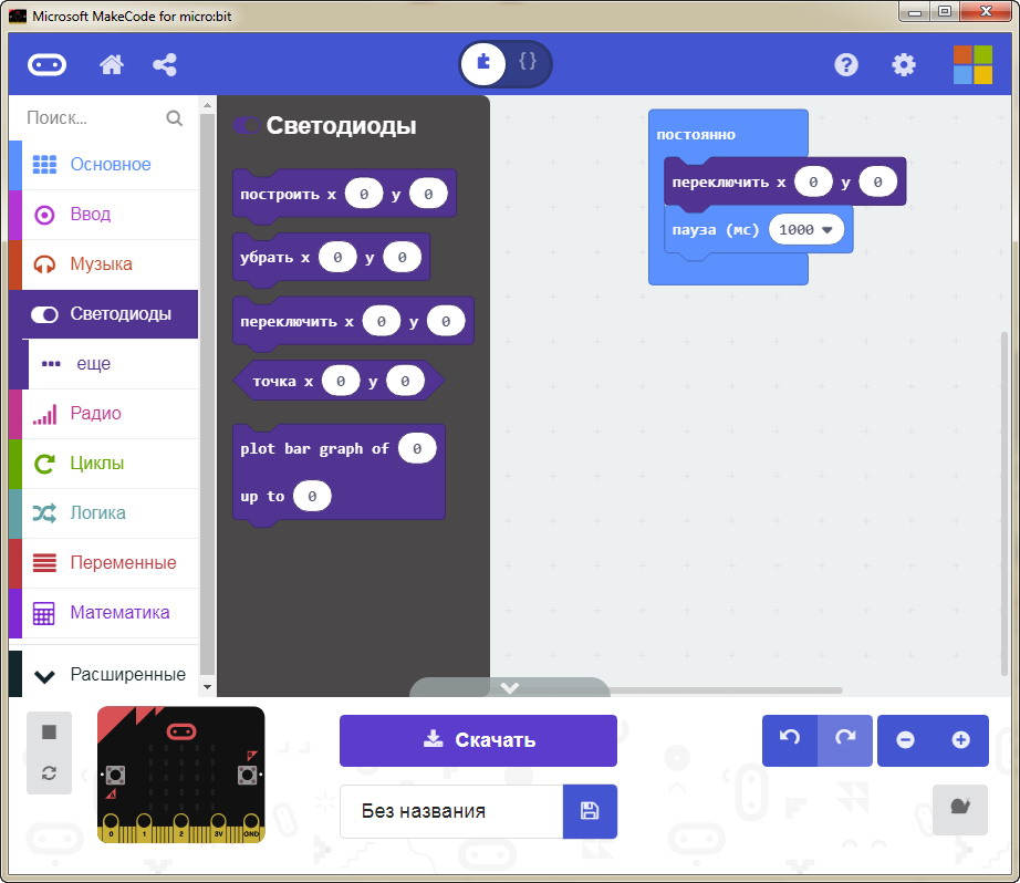 Теперь щелкните кнопку Скачать, и через некоторое время вы сможете наблюдать, как на плате micro:bit начнет мигать светодиод с координатами (0, 0). Интервал мигания составит, как и следовало ожидать, 1 сек.