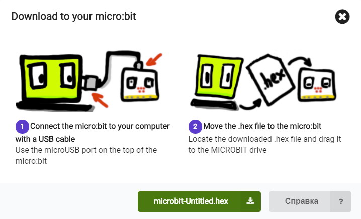 При подключении micro:bit через USB-порт в компьютере появляется дисковое устройство. Но это не настоящий диск. Если скопировать hex-файл на такой «диск», то программа загрузится в micro:bit и автоматически запустится на выполнение. После запуска она будет удалена с диска, созданного при подключении контроллера.