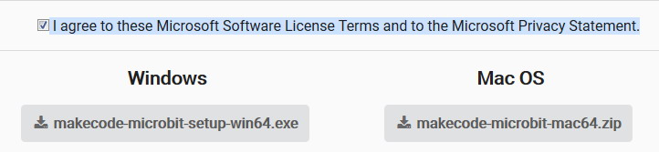 Чтобы загрузить автономную версию программы Microsoft MakeCode for micro:bit, откройте сайт https://makecode.microbit.org/offline-app. В нижней части страницы отметьте флажок I agree to these Microsoft Software License Terms and to the Microsoft Privacy Statement. После этого вы увидите ссылки на скачивание (рис. 1.2).