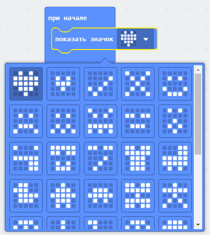 Как мы уже говорили, на экране платы micro:bit есть 25 светодиодов, что позволяет рисовать простейшие фигуры. Но делать это, зажигая каждый нужный светодиод отдельно – довольно утомительная задача. К счастью, в редакторе MakeCode есть удобные средства для рисования на экране различных значков.
