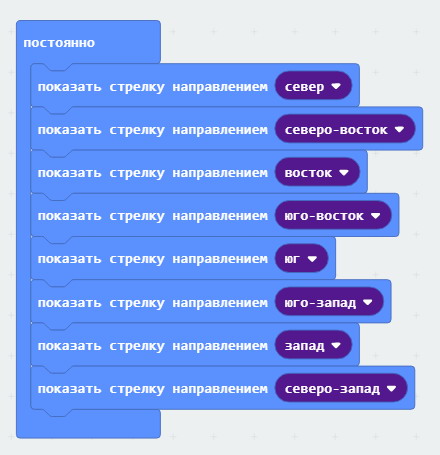 Программа вращающейся стрелки есть в архиве под именем microbit-Стрелка.hex.