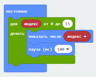 В нашей программе цикл отработает 16 раз, при этом вы увидите на мониторе micro:bit числа от 0 до 15 (рис. 2.22).