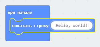 Добавьте в блок при начале блок показать строку из палитры Основное (рис. 2.23).