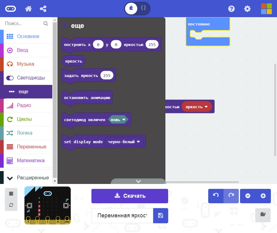 Однако теперь для включения светодиода мы используем блок построить яркостью. Этот блок зажигает светодиод с координатами (x, y) и дополнительно устанавливает для этого светодиода яркость, указанную в последнем параметре.