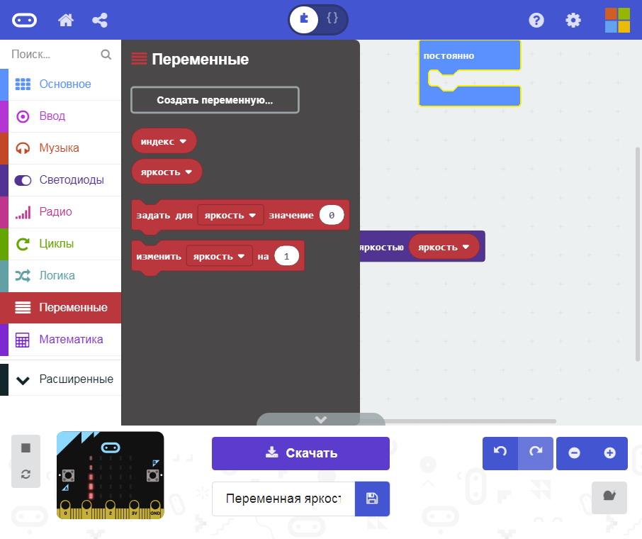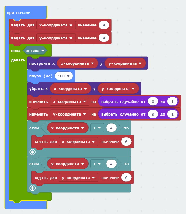 В палитре Переменные мы определили две переменные с именами x-координата и y-координата. В первой из них мы будем хранить текущую координату нашей блуждающей точки по оси X, а во второй – по оси Y. Сразу после запуска мы инициализируем эти переменные нулевыми значениями, поэтому свое путешествие точка начнет из верхнего левого угла экрана micro:bit.