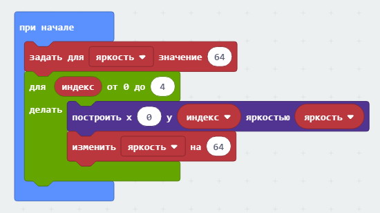 Прежде всего, для переменной яркость мы задаем начальное значение 64. Далее запускается цикл для, параметр индекс которого изменяет свое значение от 0 до 4, как и в предыдущей программе.
