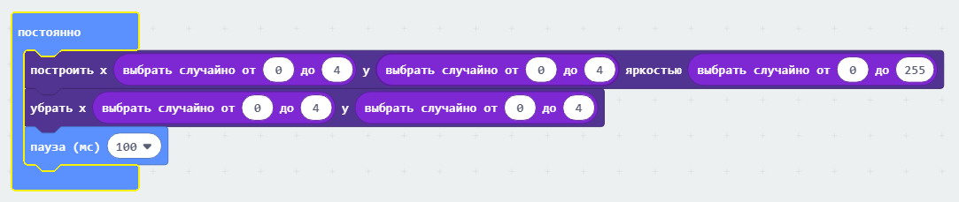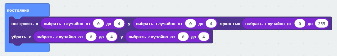 В бесконечном цикле программа с помощью блока построить зажигает светодиоды, при этом координаты (x,y) светодиода, а также его яркость, задается случайно.