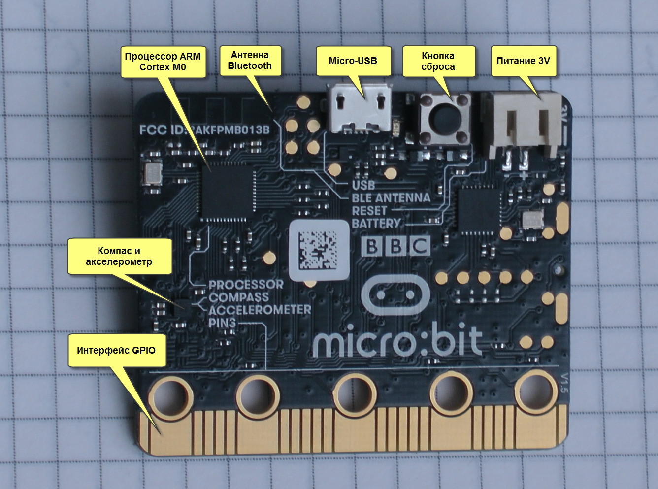 В микрокомпьютере micro:bit версии 1.5 есть три кнопки. Одна из них расположена с обратной стороны устройства и предназначена для его сброса. На рис. 3.2 эта кнопка находится в правом верхнем углу, между разъемом микро-USB и разъемом питания.