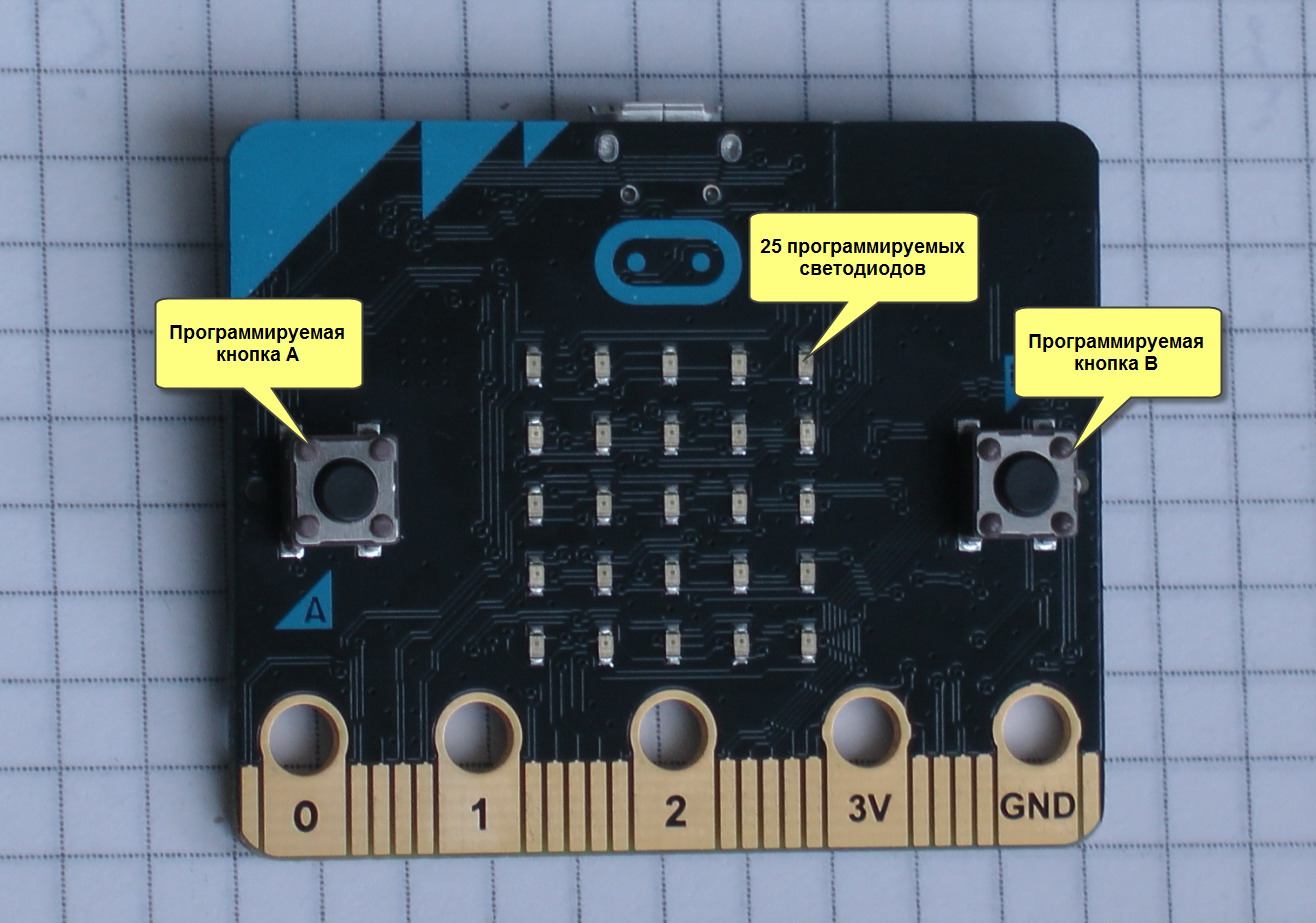 Рис. 3.3. Программируемые кнопки A и B на лицевой стороне платы micro:bit