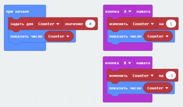 Нашей следующей программой, работающей с кнопками A и B, будет несложный счетчик. Сразу после запуска значение счетчика будет равно нулю. При нажатии кнопки A значение счетчика увеличивается, а при нажатии кнопки B – уменьшается.
