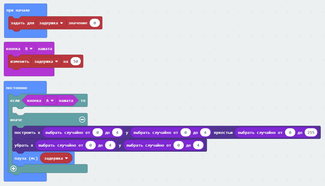 В блоке при начале мы задаем в переменной задержка начальное значение задержки, равное 0. При нажатии на кнопку B мы увеличиваем значение задержки на 50 мс.