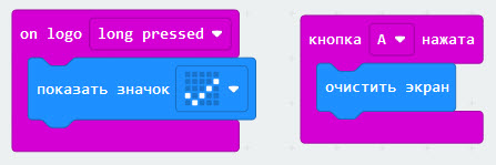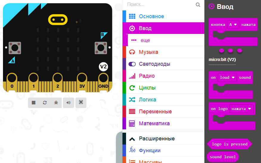 Для работы с сенсорной кнопкой в виде логотипа в палитре Ввод, в разделе micro:bit (V2) появились блоки on logo и logo is pressed (рис. 3.11).
