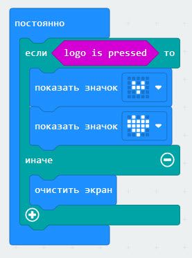 Еще одна несложная программа microbit2-Сенсорный-логотип-2.hex демонстрирует использование блока logo is pressed (рис. 3.14).