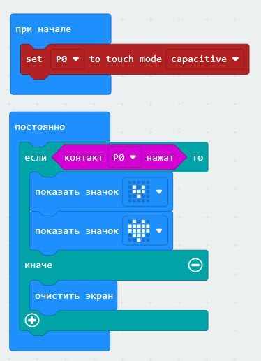 В начале своей работы программа устанавливает один из двух возможных режимов работы сенсорного контакта – емкостной или резистивный. Чтобы использовать емкостной режим, в меню блока set P0 to touch mode выберите строку capacitive, а чтобы в резистивном – строку resistive.