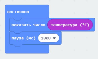 Здесь мы добавили в блок постоянно блок показать число, предназначенный для вывода числа на экран микрокомпьютера, а также блок задержки на одну секунду. В качестве значения мы вставили из панели Ввод блок температура (°C). Этот блок возвращает значение температуры процессора micro:bit в градусах Цельсия.