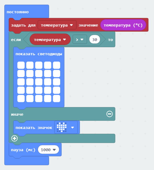Когда срабатывает условие, что значение, записанное в переменную температура, превышает 30 °С, блок показать светодиоды включает на экране все светодиоды сразу.