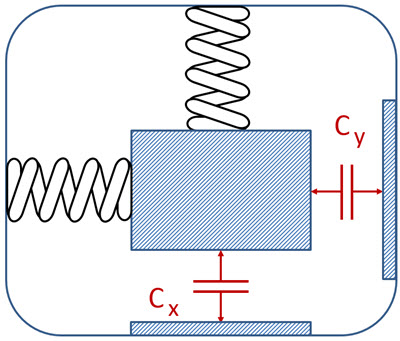 Таким образом, измеряя емкости конденсаторов в процессе движения, можно отслеживать изменение ускорения по горизонтальной и вертикальной оси. А если добавить третью пружину и еще одну металлическую пластину, то можно будет измерять ускорение во всех трех направлениях.