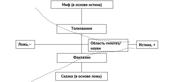Имеется некоторая аналогия с числовыми осями. Истинная информация по одной оси, в противоположную сторону антиинформация, отрицательная – ложь. Вся поверхность (или объём) – мнимая информация, то, что требует истолкования, многозначность. Соответственно информация – описание существующего, чем дальше по оси, тем полнее и достовернее, в бесконечности абсолютная истина. В этом направлении движется наука, именно движется. В противоположную сторону ложь, информация со знаком минус, что вообще-то является тоже информацией, – если знаешь, какой ответ противоположен (что верно только на оси), просто меняешь знак. Всё остальное – толкования, мнимая часть (не частичная информация, скорее непроверенная), даётся часть информации, про которую точно не известно, истинная она или нет, и её толкование, то есть варианты, которые возможны с разной вероятностью. Можно предположить два типа мнимой информации – миф, когда в основе лежат истинные явления, обросшие легендами и выдумками. Сказка – то же, но на основе явно вымышленной. Сюда же относится почти вся художественная литература. Однако в любой выдумке есть элементы реальных событий, как в мнимых числах есть вещественная составляющая. Всё это поле – толкования и фантазии, то есть миф или сказка могут быть от полной выдумки до абсолютной истины.
