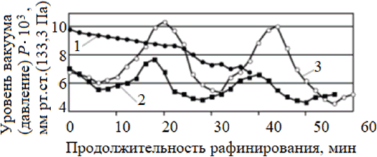 Рис. 5. Изменение уровня вакуума при проведении плавок сплава ЖС30-ВИ с различной термовременной обработкой расплава: 1620 °С (1), 1600 °С (2) и 1680 °С (3)