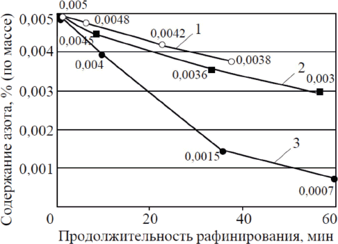Рис. 6. Изменение содержания азота в сплаве ЖС30-ВИ во время рафинирования расплава при температурах 1560 (1), 1620 (2) и 1680 °С (3)