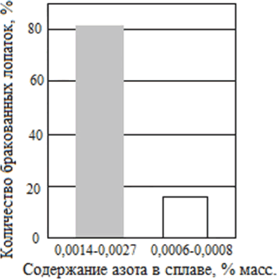 На рис. 7 приведены статистические данные моторостроительного завода по количеству бракованных по макроструктуре лопаток из сплава ЖС30-ВИ, отлитых с монокристаллической структурой из металла с высоким и низким содержанием азота; при содержании в сплаве > 0,001 % азота (фактически 0,014–0,027 %) бракованных лопаток оказалось > 80 %, в то время как при содержании азота < 0,001 % (фактически 0,0006–0,0008 %) таких лопаток всего 15 %.