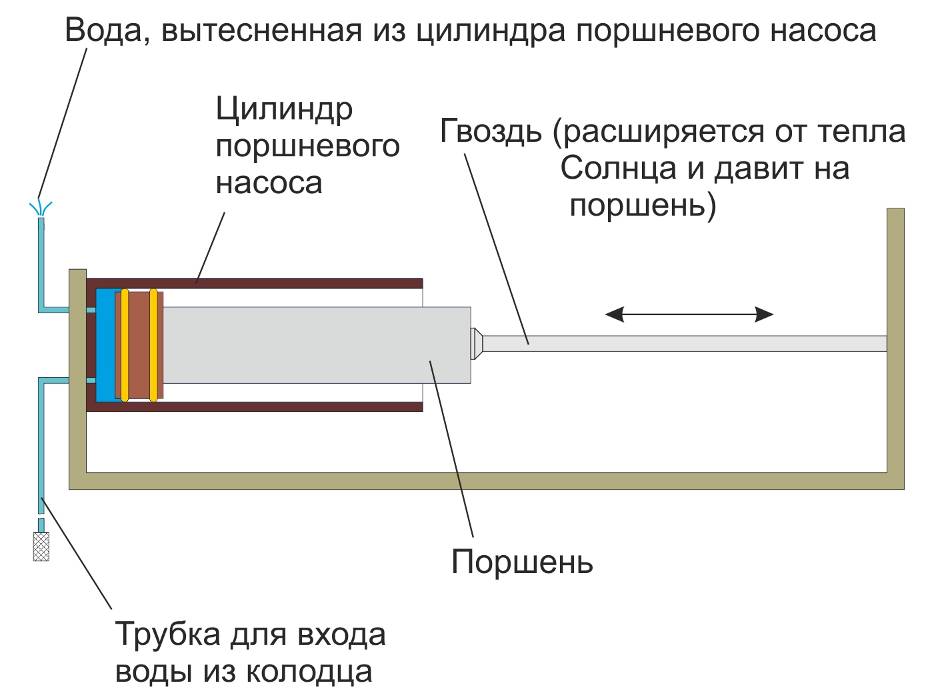 Схема поршневого насоса, работающего от Солнца, с использованием гвоздя
