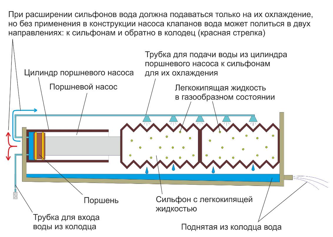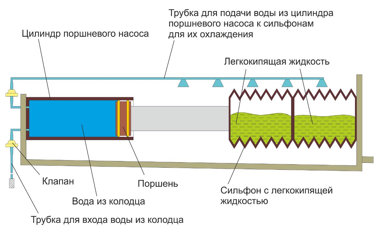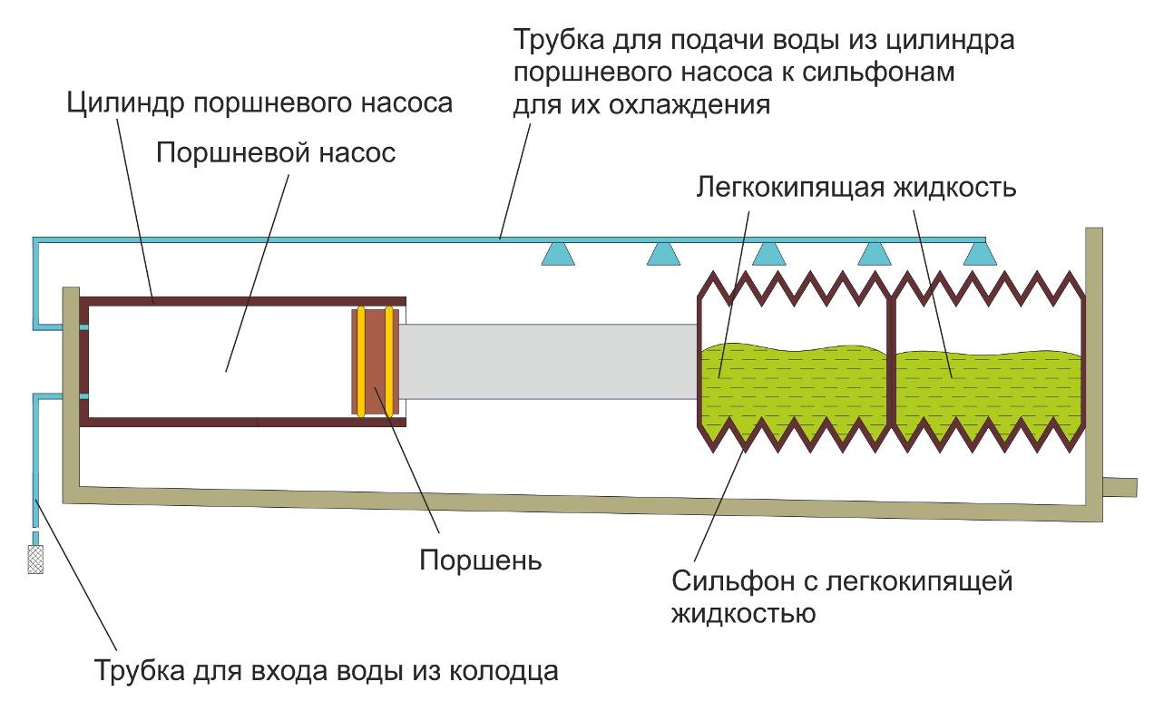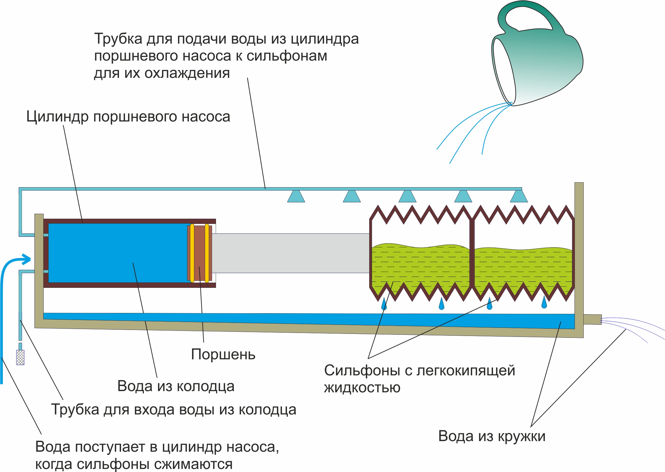 Схема поршневого насоса, работающего от Солнца (сильфоны охлаждаются водой из кружки)