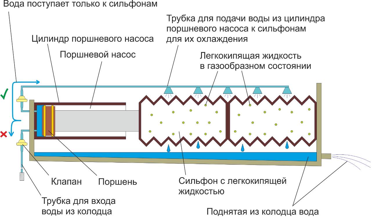 – Когда они начнут сжиматься, то будут вытягивать поршень из цилиндра, и в цилиндр будет закачиваться вода из колодца.