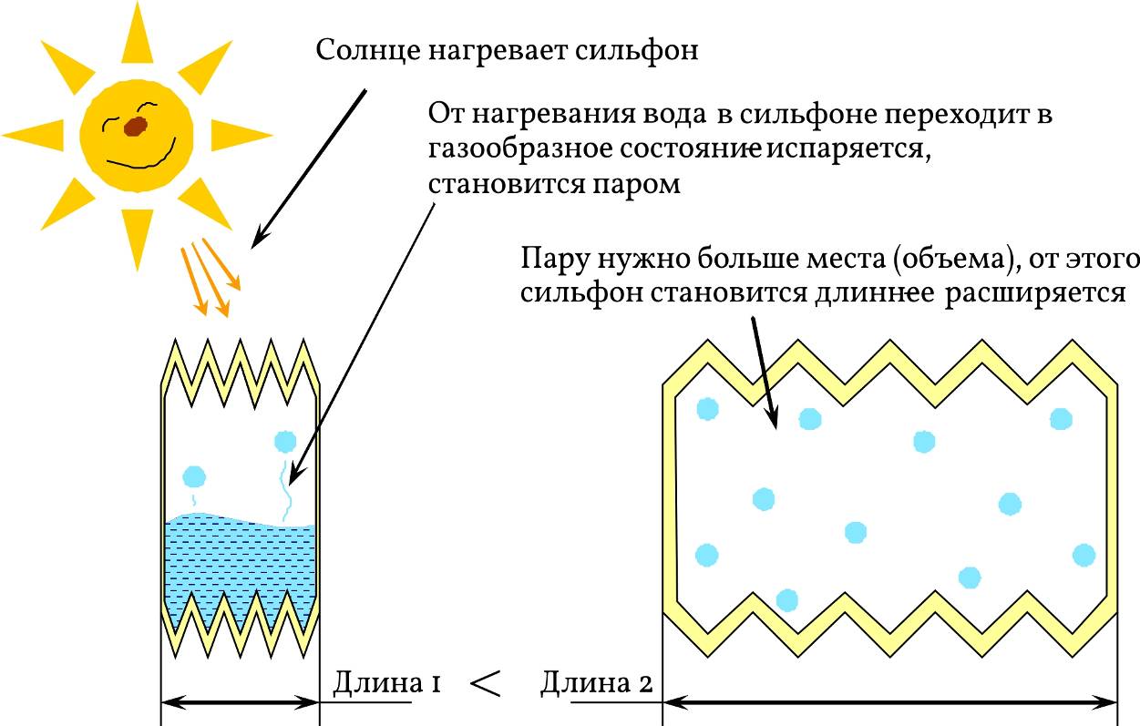 Солнце нагревает гармошки-сильфоны, они удлиняются и давят на поршень, который задвигается в цилиндр.