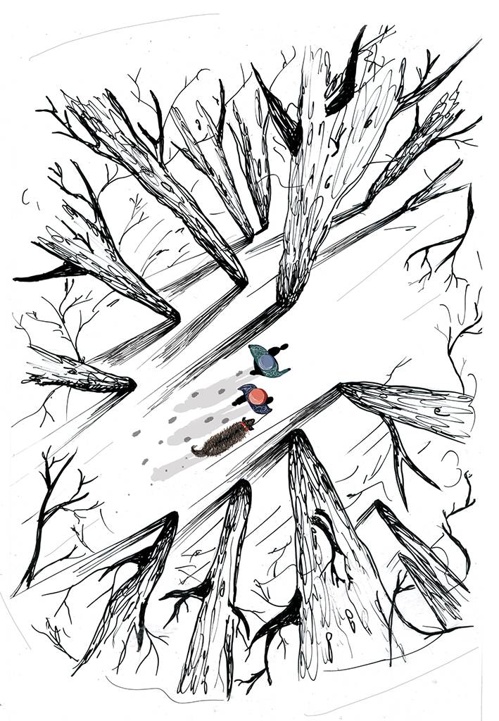 Шмеля отвязали от скамейки. И направились вниз к реке. Мальчики хотели бежать, но пёс тащился медленно и периодически останавливался, чтобы выгрызть из подушечек на лапах набившийся снег.