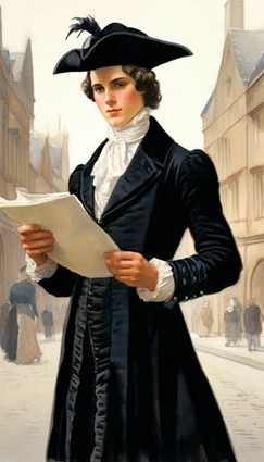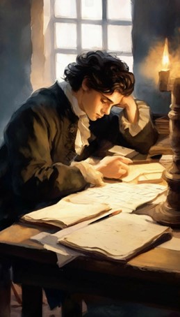 Молодой человек был небольшого роста, с маленькими кистями рук и ступнями ног. Кожа его лица была бледной, со слабым румянцем. Его костюм составляли тёмный кафтан, такой же камзол, плисовые штаны, белые шёлковые чулки и башмаки с серебряными пряжками на высоких каблуках. Густые светло-русые волосы стягивала лиловая лента. Шляпу он держал в руках.