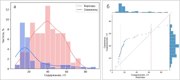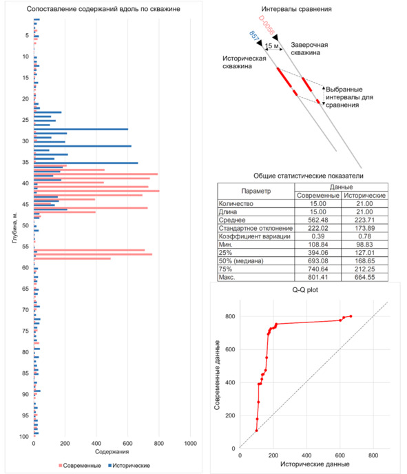 И вот здесь начинается самое интересное. Во-первых, не очень понятно, как сопоставлять исторические данные с современными. Просто сравнить полностью выборку современных данных и полностью выборку исторических данных – не вариант, учитывая схему опробования. Любые попытки подобного сопоставления дают совершенно ожидаемый результат завышения содержаний в данных предыдущих периодов.
