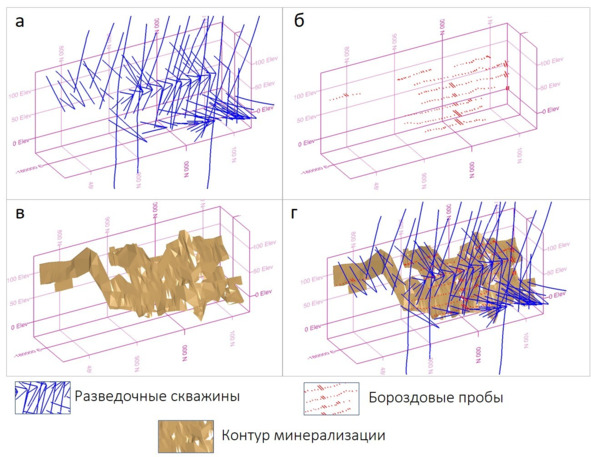 a – разведочные скважины, б – бороздовые пробы, в – контур минерализации, г – общий вид