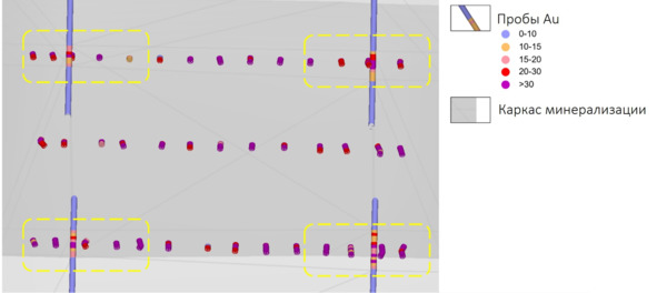 Но чаще всего так не получится: борозды отбирались по горизонтам выработок, а разведка скважинами запроектирована таким образом, чтобы освещать пространство между горизонтами. Соответственно, между ближайшими пробами может быть и 5, и 10 м, и мы возвращаемся в исходную точку.