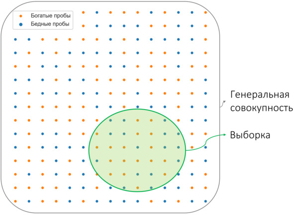 Генеральная совокупность – некая математическая абстракция, это выборка, которая содержит все возможные значения некоторой величины для данного объекта. То есть это «все возможные данные». Например, генеральной совокупностью можно считать данные о содержании какого-либо компонента в каждой точке рудного тела (генеральная совокупность содержаний по данному рудному телу), участку месторождения (генеральная совокупность содержаний по участку месторождения). Из подобного «определения» становится ясно, почему генеральная совокупность – это абстракция: просто потому, что в большинстве случаев она недостижима. Даже обладая бесконечным финансированием, невозможно получить содержания в каждой точке рудного тела/участка/месторождения.