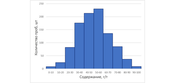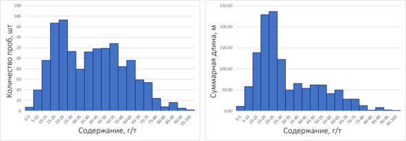 – Для каждого класса содержаний подсчитываем количество проб, попавших в класс. При подсчете обычно в класс включают нижнюю границу – т. е. содержание 10 г/т войдет в класс от 10 до 20 г/т, а не в класс от 0 до 10 г/т. Хотя возможна и обратная схема. Но в любом случае – схема включения граничных содержаний должна быть едина, и каждая проба должна быть учтена только в одном классе.