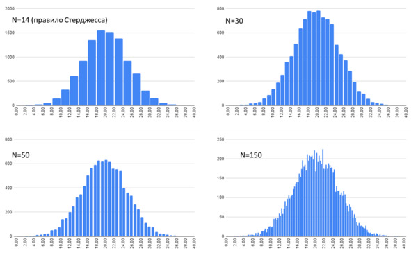 Обычно количество классов подбирается таким образом, чтобы на гистограмме были видны важные особенности, но при этом гистограмма продолжала бы быть похожей на гистограмму, а не на творение художника-абстракциониста или на картинку с одинокими столбцами, разделенными «белым безмолвием». Обычно количество классов не превышает 50 (для выборок объема в несколько десятков тысяч значений). При избыточном количестве классов на небольших выборках очень несложно обнаружить неоднородность, обусловленную исключительно разбиением на классы. На рисунке ниже представлена гистограмма, построенная для выборки в 1000 записей, представляющих собой сгенерированное однородное (нормальное) распределение со средним 20 и стандартным отклонением 5. N для данного рисунка – количество классов разбиения.