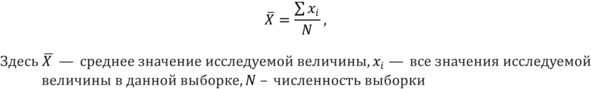 Следующая характеристика выборки – это выборочное среднее. Зачастую слово «выборочное» опускают и говорят просто о «среднем». Вообще говоря, существует довольно большое количество средних, однако чаще всего при упоминании «среднего» имеют в виду среднее арифметическое. Среднее (арифметическое) – это величина, которая рассчитывается по формуле, хорошо знакомой еще из школьного курса.