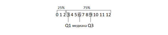 Здесь первый квартиль Q1 – число, отделяющее первую четверть выборки: 25% значений меньше, а 75% – больше него. Медиана – половина значений больше и половина меньше нее. Третий квартиль Q3 – это отсечка трех четвертей: 75% значений меньше и 25% значений больше него. Межквартильный размах – это расстояние между Q1 и Q3. Или, по-другому, межквартильный размах – это размах половины данных. Причем данных «из центра» распределения.