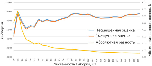 Выборка сгенерирована с помощью генератора случайных чисел (в генератор заложена дисперсия 10), поэтому абсолютные цифры могут несколько «гулять», но тенденция видна невооруженным глазом: при численности выборки более ~100 наблюдений разница между смещенной и несмещенной оценками падает ниже 1% от дисперсии (кстати, на втором листе файла Excel, ссылка на который была чуть выше, эти формулы заложены – можете поиграть с ними). Учитывая обычные объемы выборок для моделирования, можно не забивать себе голову вопросами «это смещенная или несмещенная оценка?».