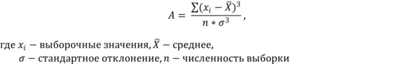 Итак, у нас есть набор выборочных значений, основная масса которых группируется «слева» или «справа». Логично задать себе вопрос: слева или справа от чего? Видимо, от среднего арифметического. То есть, если мы попытаемся рассчитать разность (Xi – Xсреднее), то среднее подобных разностей должно бы нам показать направление и величину отклонений выборочных данных от среднего. Возможно, должно, но не будет: сумма подобных разностей всегда будет нулевой – по механизму расчета среднего. Казалось бы, можно возвести в квадрат – как это делалось для расчета дисперсии. Но проблема в том, что знак разности (Xi – Xсреднее) нужен (мы ж хотим понимать – значение ушло «влево» или «вправо» от среднего), а при возведении в квадрат знак «потеряется». Логично тогда использовать нечетную степень – она позволит избежать обнуления суммы разностей, с одной стороны, и «не потеряет знак» разностей – с другой. Первая нечетная степень – 3. То есть логично рассчитать среднее арифметическое кубов разностей. Также хотелось бы, чтобы конструируемая величина допускала сравнение асимметрии распределений разнородных данных, возможно, даже измеренных в разных единицах. То есть эта величина должна быть безразмерной – как сконструированный ранее коэффициент вариации. И кажется вполне логичным, что наше среднее должно быть нормировано на стандартное отклонение – т. е. показывать, во сколько раз асимметрия выборки больше, чем характеристика ее размаха. Ну, а учитывая то, что:
