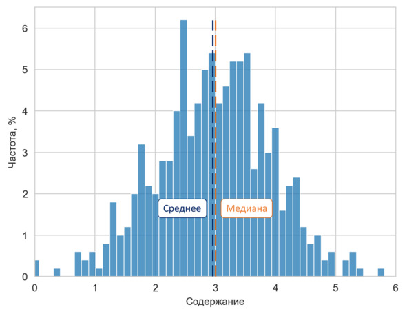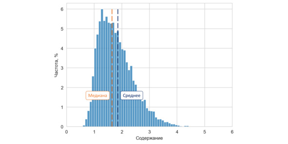 При построении гистограмм можно получить график как симметричный, в котором больших и малых значений «примерно поровну», так и асимметричный – с преобладанием высоких или низких значений. Для условий данных опробования цветных или драгоценных металлов асимметричный график встречается намного чаще симметричного. Логично, что нужна некая точная характеристика асимметрии, которая позволила бы избежать волюнтаризма в определении степени асимметричности выборки. Так давайте же сконструируем такую характеристику.