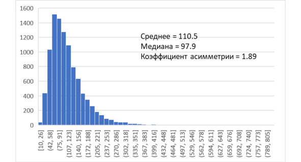 Гистограмма с правой асимметрией в логарифмическом масштабе