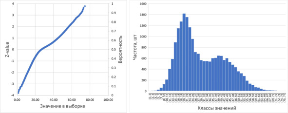 По степени «прямоты» вероятностной кривой можно судить о близости рассматриваемого распределения нормальному закону, по наличии резких перегибов и относительно прямолинейных участков на графике – об однородности или неоднородности, а по наличию «срывов» и горизонтальных «ступенек» – о наличии выбросов.