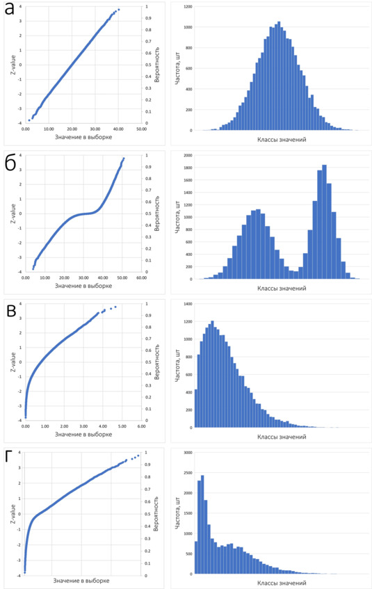 Вероятностная кривая и соответствующая ей гистограмма: а – однородного симметричного распределения, близкого к нормальному, б – неоднородной выборки, представляющей собой объединение двух симметричных выборок, каждая из которых близка к нормальному распределению, в – однородной выборки с большой правой асимметрией, г – неоднородной выборки (интересно то, что обе сгенерированные выборки характеризуются правой асимметрией, которая при их смешении почти не видна)
